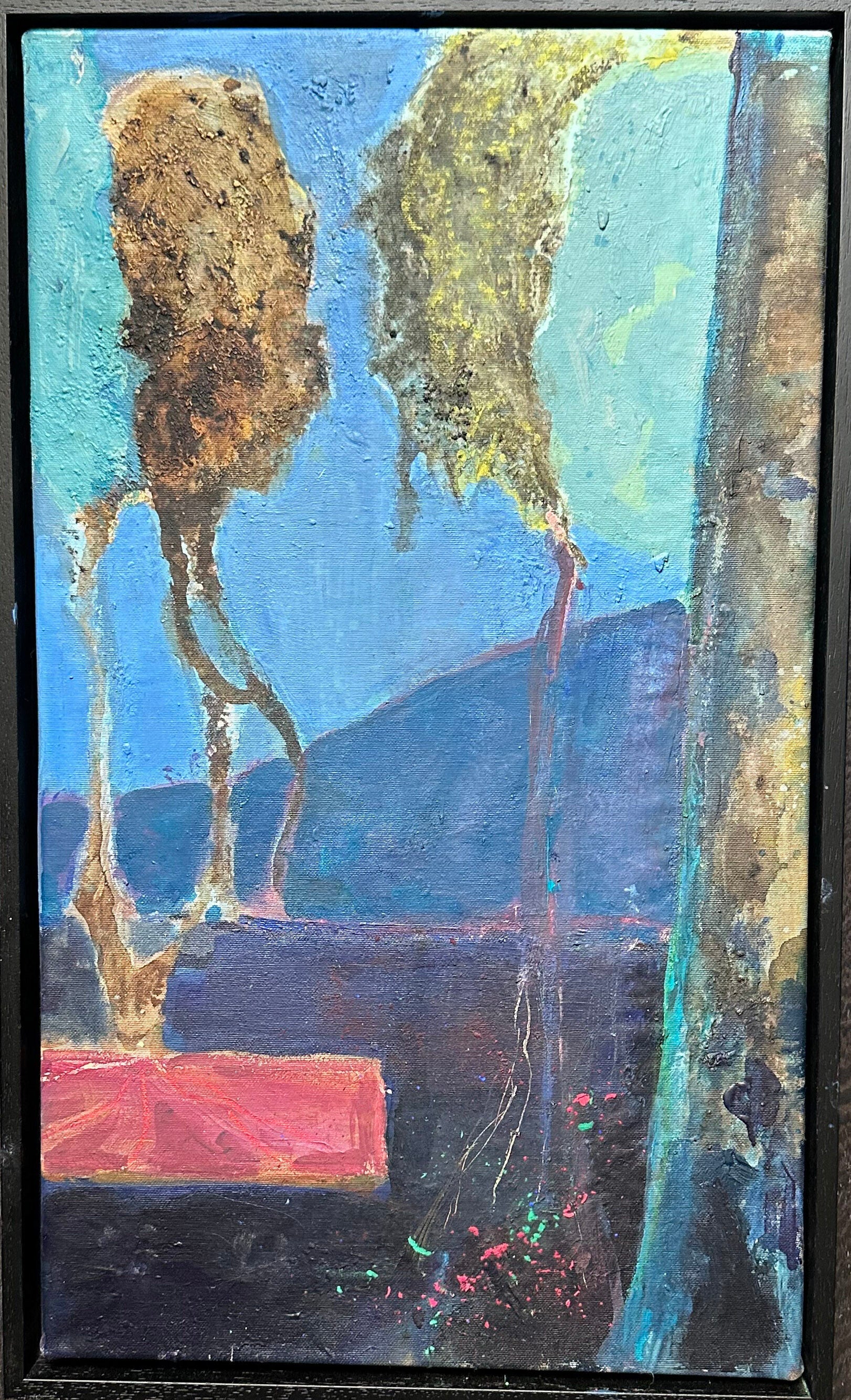 Een mixed media werk dat uitnodigt tot een ontdekkingsreis. De bomen lokken je het landschap in, de heuvel op, en wie goed kijkt, ziet onder de grond de wortels en schimmels die alles met elkaar verbinden. Het verborgen netwerk van voeding en leven komt langzaam tevoorschijn.