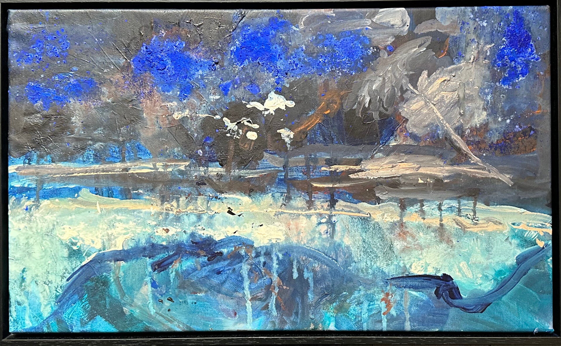 Een landschap in blauwe tinten dat je direct naar binnen trekt. Wat zie je precies? Water, bomen, lucht, het blijft in beweging en laat ruimte voor je eigen verbeelding. Een plek die uitnodigt om verder te verkennen.